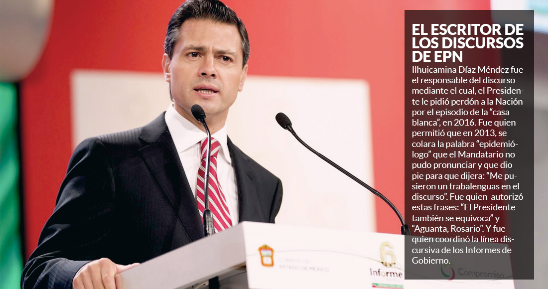 Ilhuicamina Díaz Méndez fue el responsable del discurso mediante el cual, el Presidente le pidió perdón a la Nación por el episodio de la “casa blanca”, en 2016. Fue quien permitió que en 2013, se colara la palabra “epidemiólogo” que el Mandatario no pudo pronunciar y que dio pie para que dijera: “Me pusieron un trabalenguas en el discurso”. Fue quien autorizó estas frases: “El Presidente también se equivoca” y “Aguanta, Rosario”. Y fue quien coordinó la línea discursiva de los Informes de Gobierno.