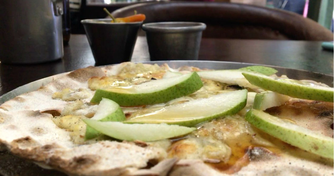 En alguna de las otras visitas, tal vez a su local de la Alameda, descubrí la pizza de queso gorgonzola, romero, miel, pera y nuez. Deliciosa al salir del horno, un poco dulce, un poco salda, con el toque fresco de la fruta.