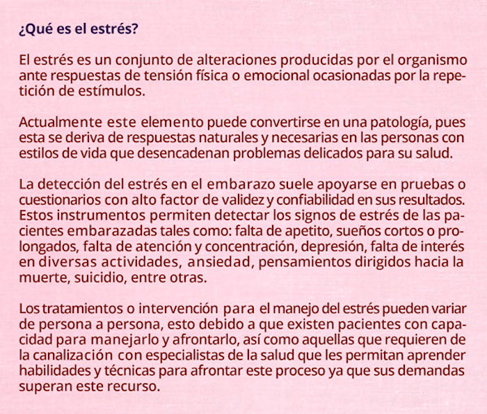 “En general, las acciones enfocadas en resolver los problemas de riesgo obstétrico en nuestro país son muy útiles, ya que cubren una gama importante de alteraciones durante el embarazo; sin embargo, en México la evaluación general de la salud mental materna no se considera durante la atención prenatal, ya que aún no existe evidencia soportada en estudios en nuestro país en donde se establezca esa asociación. Por eso, el objetivo de nuestro estudio consistió en poder evaluar la participación del estrés materno en el desarrollo de estos trastornos”.