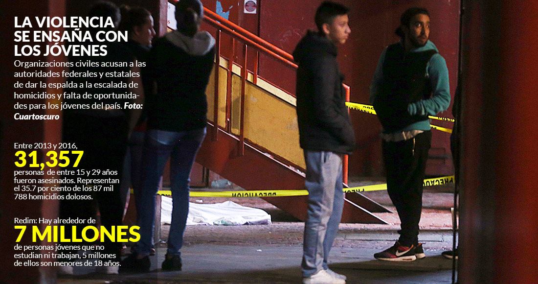 Entre 2012 y 2016, en el marco de la denominada “guerra contra el narcotráfico” que inició en 2006, una de cada cinco víctimas de homicidio fue un joven de entre 15 y 24 años, refieren datos del Instituto Nacional de Estadística y Geografía (INEGI). A pesar de que en ese periodo los homicidios –en general– fueron a la baja, sin embargo, la tasa de asesinatos de jóvenes se mantuvo casi intacta, a partir de 2013, con márgenes de 21 por ciento del total de homicidios por año.