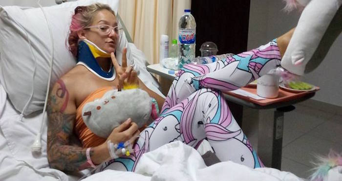 "Recibí 8 puntos de sutura en mi cabeza. Estoy hospitalizada en este momento. No estoy paralizada, puedo mover mis brazos y piernas, pero aún no puedo caminar. Mi columna vertebral no puede soportar mi peso, además estoy bastante débil y aturdida", afirma la joven estadounidense.