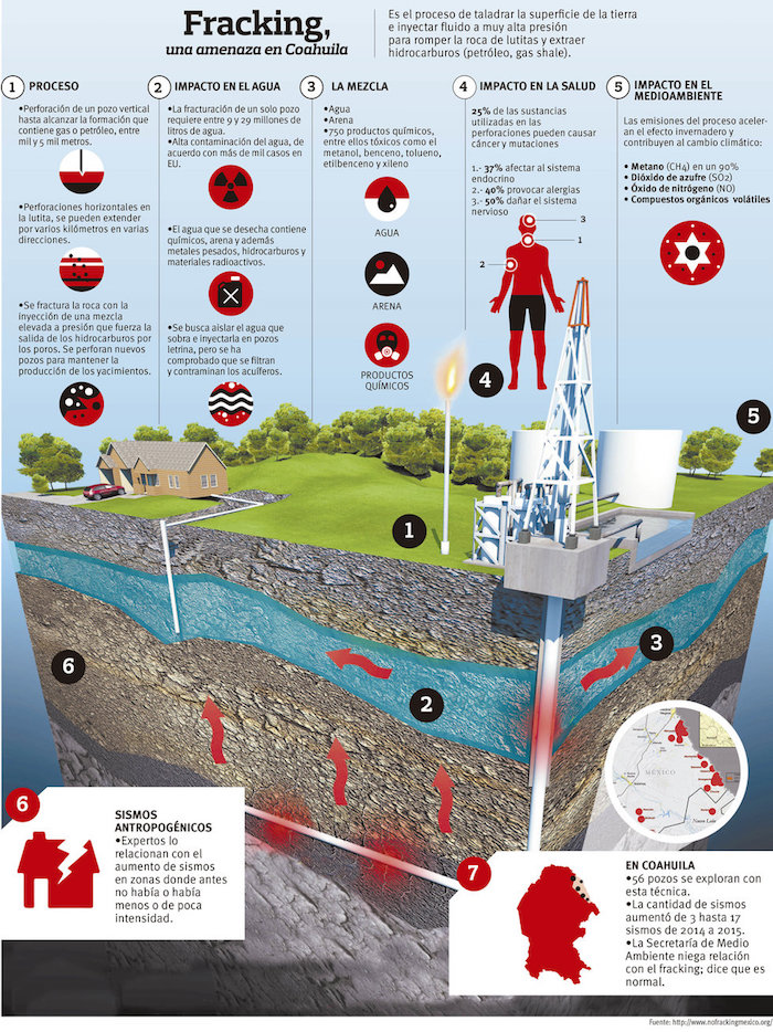 “Por la ubicación geográfica de los pozos exploratorios perforados con técnicas de fracking, difícilmente se puede establecer una vinculación entre esta actividad y los sismos registrados en Coahuila, como es el caso más reciente, que tuvo lugar en el municipio de San Pedro, en el suroeste del estado. Dicho de otra manera, ninguno de los siete pozos hasta ahora perforados ha provocado un temblor en su entorno inmediato”, escribió.