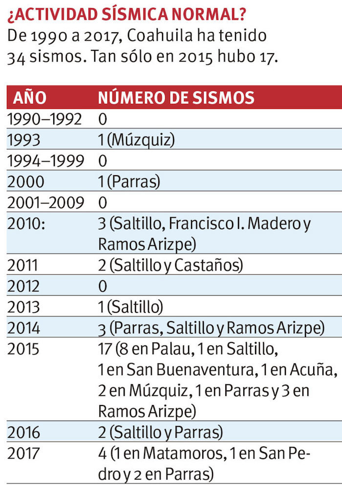 De acuerdo con las declaraciones del estudioso sobre el tema, en Coahuila, de 2014 a 2015, la cantidad de sismos aumentó de 3 hasta 17 sismos. Y relacionó la baja y el aumento del nivel sismológico, de acuerdo con el precio del gas.