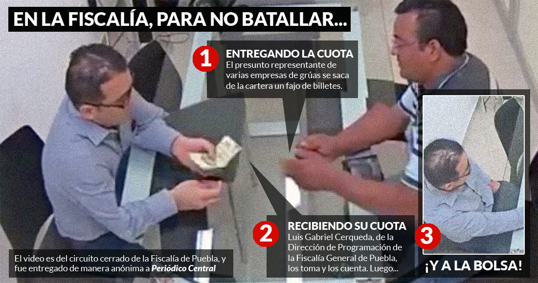 El titular del área de la Dirección de Programación de la Fiscalía General del Estado de Puebla, Luis Gabriel Cerqueda, fue exhibido en un video recibiendo dinero de manos de un representante de los propietarios de grúas, quienes pagan al funcionario 4 mil pesos —cada uno y a la semana— para mantener el control de los arrastres de vehículos a los corralones de la dependencia.