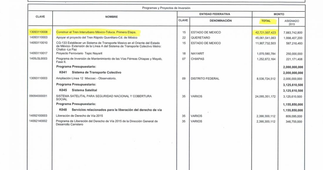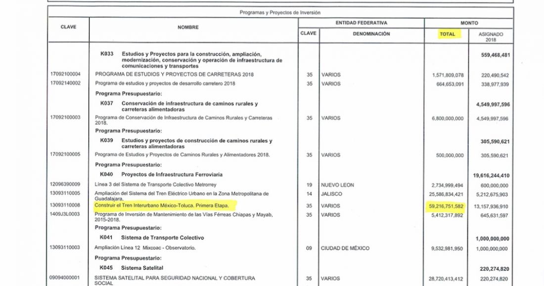 De acuerdo con el Presupuesto de Egresos de la Federación de los últimos cinco años, el presupuesto destinado al Tren Interurbano pasó de 21 mil 504 millones 965 mil 473 pesos en 2014 a 59 mil 216 millones 751 mil 582 pesos para 2018, un 175 por ciento más de lo presupuestado e un inicio.