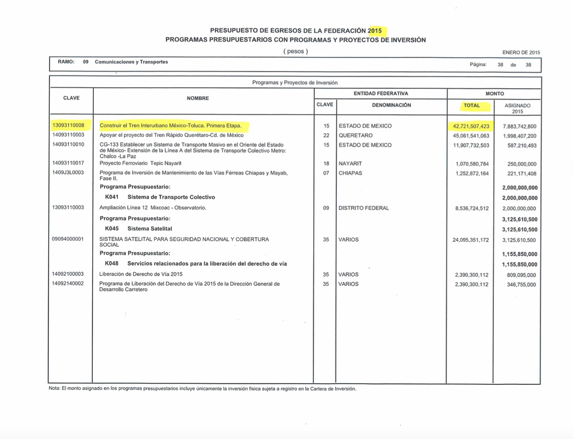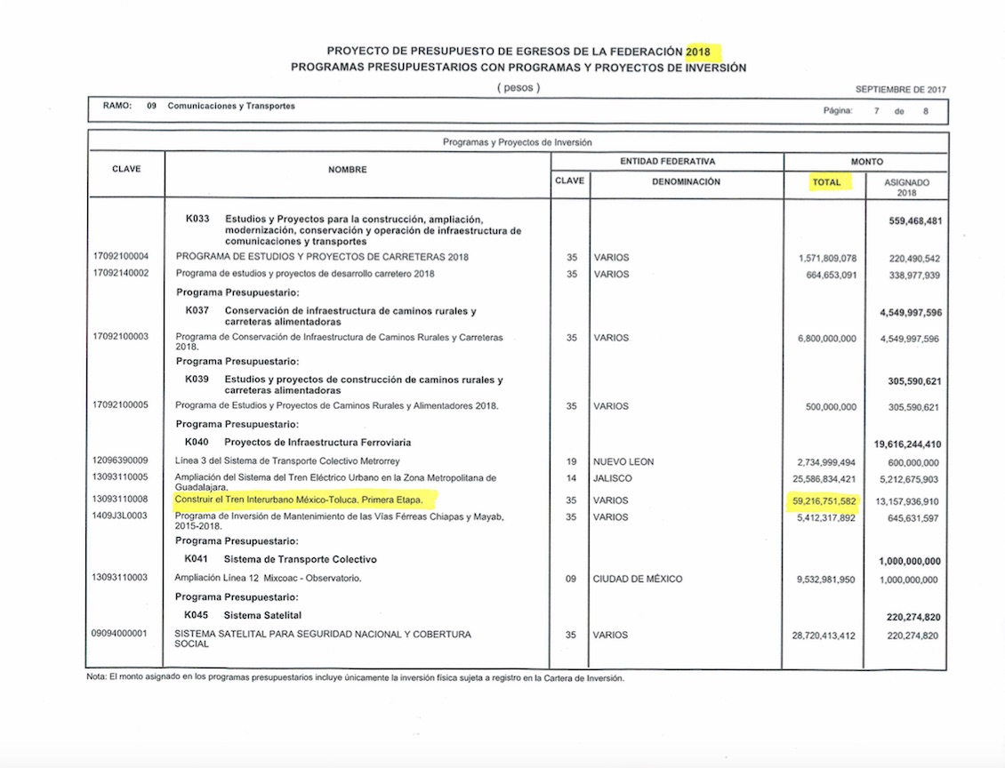 De acuerdo con el Presupuesto de Egresos de la Federación de los últimos cinco años, el presupuesto destinado al Tren Interurbano pasó de 21 mil 504 millones 965 mil 473 pesos en 2014 a 59 mil 216 millones 751 mil 582 pesos para 2018, un 175 por ciento más de lo presupuestado e un inicio.