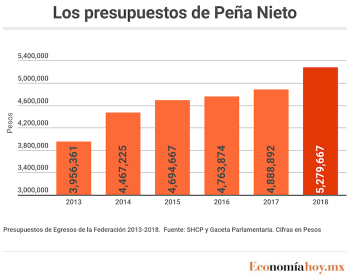Con un total de 5 billones 279 mil 667 millones de pesos, el del año que viene el gobierno mexicano gastará un 33.44 por ciento más que en su primer año, cuando el PEF 2013 ascendió a 3 billones 956 mil 361 millones de pesos, y un 8 por ciento mayor al aprobado para 2017, cuando los egresos aprobados sumaron 4 billones 888 mil 892 millones de pesos.