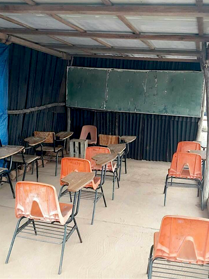 Julio cursa el primer grado de Telesecundaria junto con otros 13 niños, en un aula improvisada por los profesores, hecha con láminas, ramas, y lonas. La escuela "Juan Escutia" agrupa un total de 74 alumnos de escasos recursos, detalla la docente.
