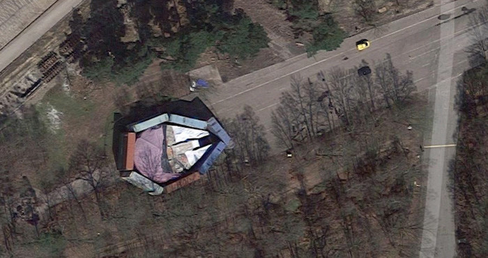 La imagen muestra la mítica nave espacial rodeada por varios contenedores de diferentes colores y cubierta con láminas de plástico. Foto: RT