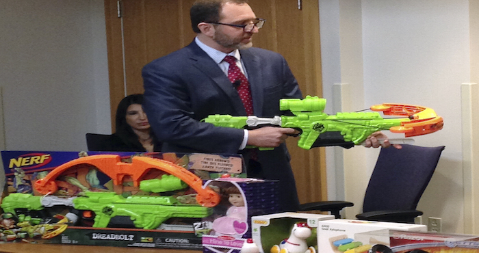Siff enfatizó que los juguetes nocivos contienen aspectos peligrosos que se destacan año tras año. Señaló como ejemplo el caballito para jalar "Pull Along Pony" de Tolo Toys, que se promociona como apto para niñitos de un año pero contiene un cable de 48 centímetros (19 pulgadas).