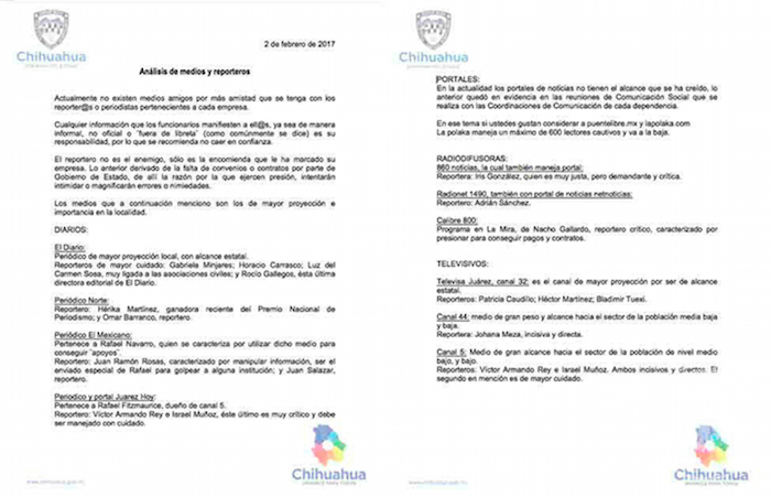 Artículo recordó que a principios de mayo de este año fue filtrada a medios de comunicación la existencia de una lista de periodistas incómodos proveniente de la Coordinación de Comunicación Social donde se incluye al Diario de Juárez y a varios de sus integrantes (incluída Gallegos).