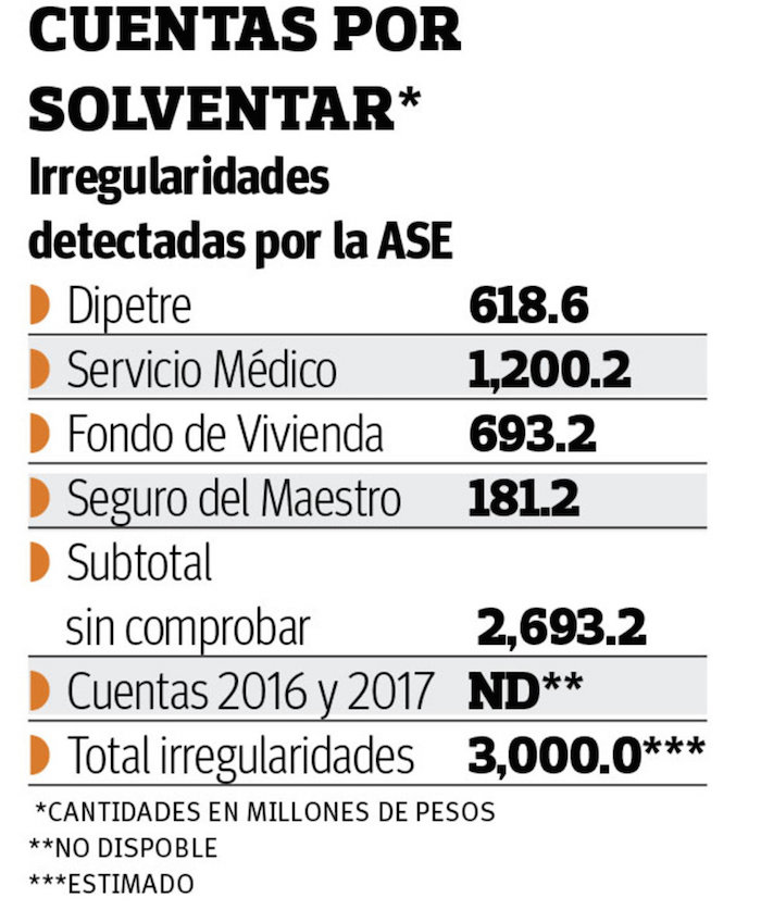 Finalmente en cuanto al Seguro del Maestro, no se solventaron 181 millones 256 mil 772 pesos, por lo que si se suman las observaciones pendientes en las cuatro instituciones, hay 2 mil 693 millones 442 mil 621 pesos que no fueron comprobados.