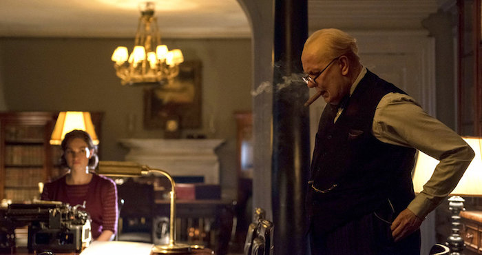 El que Oldman sea un actor de actores encaja bien en el caso de "Darkest Hour". El director Joe Wright ("Atonement", ''Pride & Prejudice") muestra al mismo Churchill como un actor desempeñando un papel. Con un sombrero Homberg y un puro como su vestuario, une a la Gran Bretaña de 1940 para evitar el pacifismo ante Adolfo Hitler. Churchill, una figura impopular cuando fue primer ministro, se muestra dudoso en privado y majestuoso en público, mientras incita al parlamento en sus famosos discursos, como cuando advirtió que la inacción de Gran Bretaña "la hundirá en el abismo de una nueva era oscura aún más siniestra".