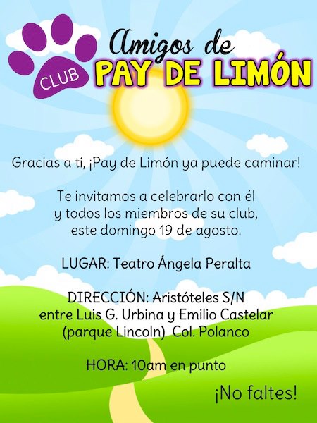 Este domingo 19 de agosto a las 10 am, en el Teatro Ángela Peralta de Polanco, se llevará a cabo un festejo por parte de "Milagros Caminos" para celebrar que Pay de Limón puede caminar de nuevo.
