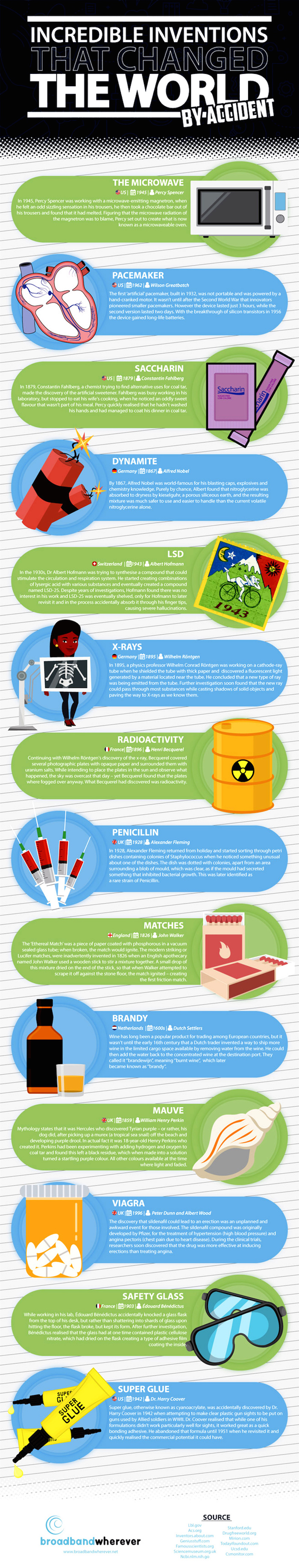 · EL MICROONDAS: En 1945 Percy Spencer estaba trabajando cerca de un magnetor y de repente se dio cuenta de que se había derretido una chocolatina que llevaba en el bolsillo por la radiación. Así, Spencer descubrió cómo podría usarse el magnetor para crear el horno de microondas que casi todos tienen en su cocina.