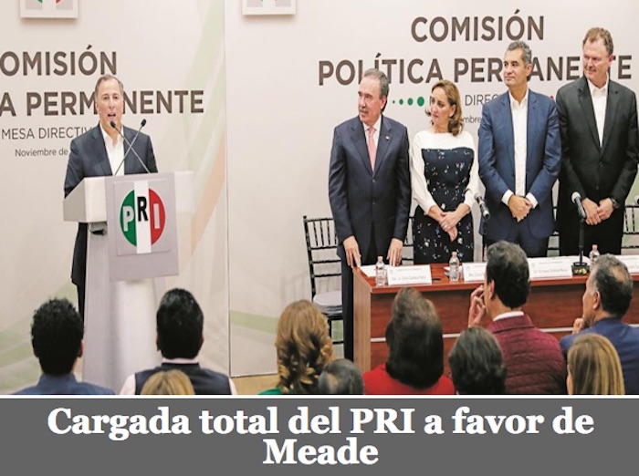 Otros diarios, como El Universal y Milenio Diario, buscaron marcar cierta distancia: “Cargada total del PRI a favor de Meade” y “Se somete el PRI al apartidista Meade”, cabecearon respectivamente. Está bien, pero algo mucho más directo hubiese sido: “Se somete el PRI a la elección de Peña Nieto”, pero eso es impensable que ocurra en una prensa que casi no cuestiona al presidente en sus portadas.