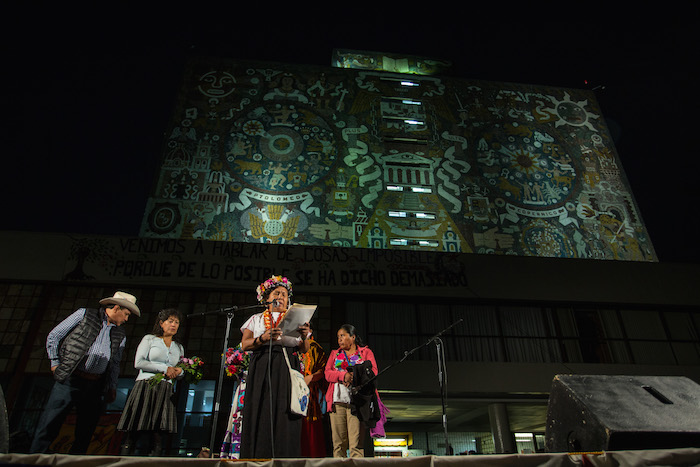Mientras iba oscureciendo, Marichuy pronunciaba un discurso que no solo aludía a las comunidades indígenas sino también a los movimientos estudiantiles como colectivos desfavorecidos por el sistema capitalista.