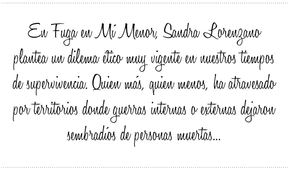 En Fuga en Mí Menor, Sandra Lorenzano plantea un dilema ético muy vigente en nuestros tiempos de supervivencia. Quien más, quien menos, ha atravesado por territorios donde guerras internas o externas dejaron sembradíos de personas muertas, desaparecidas, que modificaron el entorno íntimo de mucha gente y que no dejaron indemne el contexto social imperante.