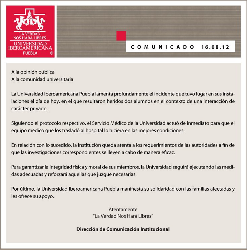 [tweet https://twitter.com/paparrinmunoz/status/236193264536023040 lang='es']Por su parte, la Universidad Iberoamericana emitió un comunicado en el que informa que los hechos se dieron a partir de una interacción de caracter privado y que fueron atendidos a la brevedad por Servicios Médicos.