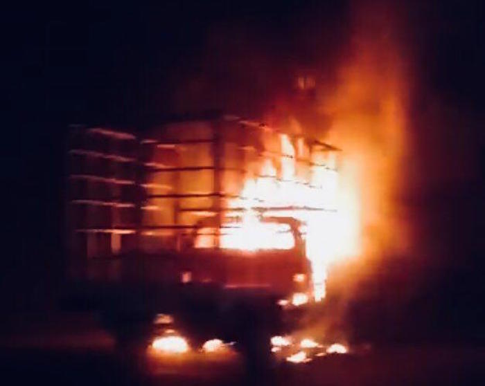 Minutos después, a las 21:15 horas, se reportó una camioneta incendiándose en la avenida Lázaro Cárdenas, en la salida a Salvatierra, era un vehículo Nissan, con tablillas de circulación del estado de Michoacán.