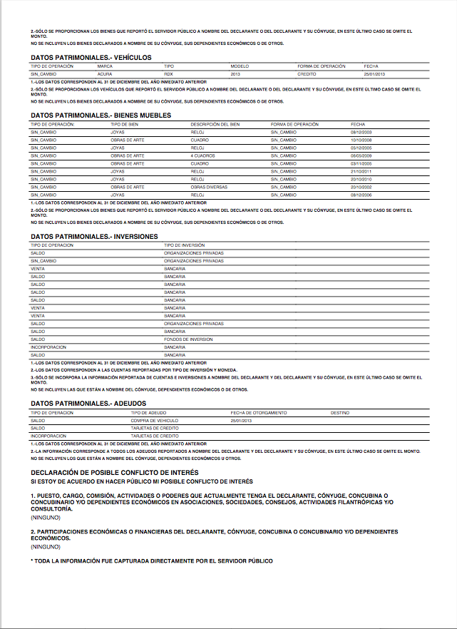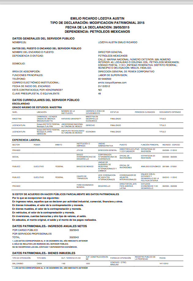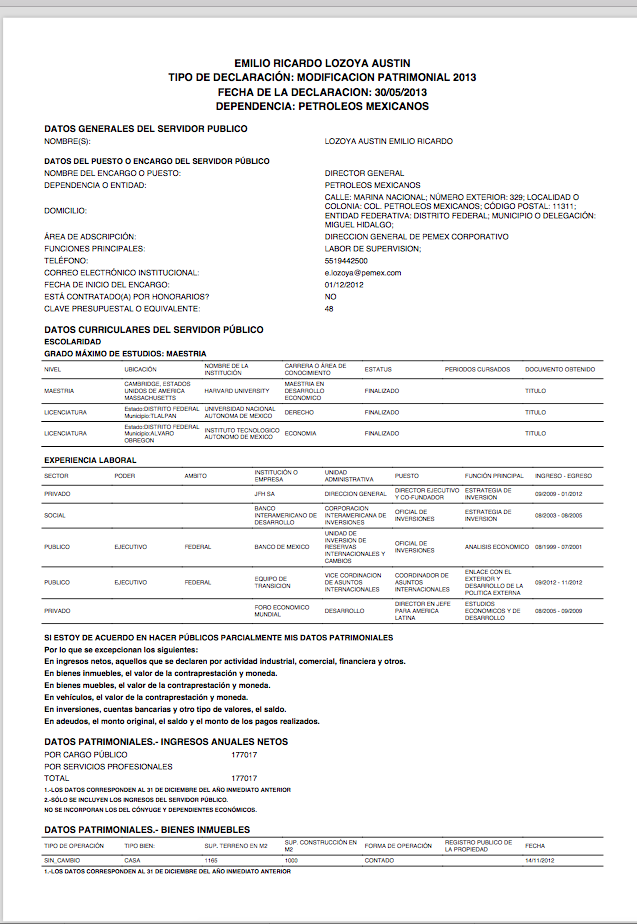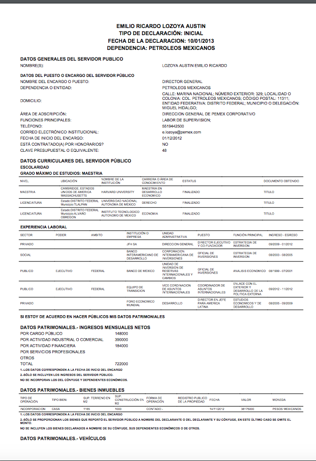Mientras fue servidor público, Lozoya Austin no sólo tuvo cuentas bancarias. También contaba con un fondo de inversión en dólares americanos, así como títulos en organizaciones privadas. Los montos en las cuentas de Lozoya sólo fueron públicos en 2013, en su declaración patrimonial “inicial”. Después se abstuvo de publicarlos. En 2016, cuando renunció, su declaración final se redujo a su currículum.