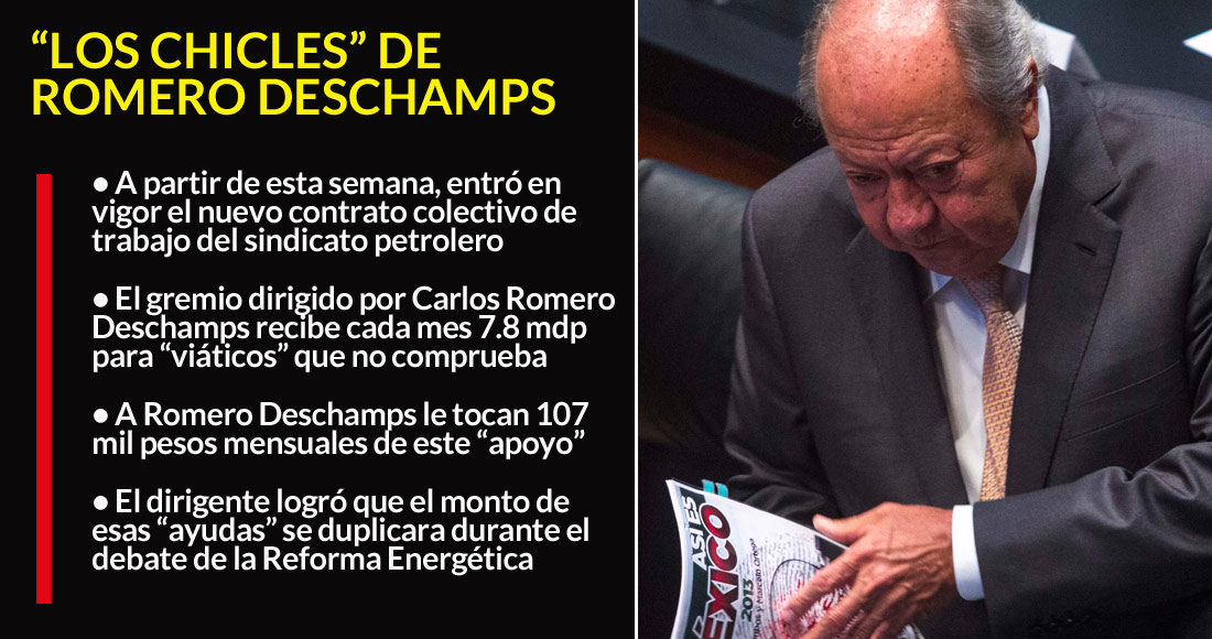 Ciudad de México, 11 de diciembre (SinEmbargo).– Carlos Romero Deschamps seguirá al frente del Sindicato de Trabajadores Petroleros de la República Mexicana (STPRM) hasta el año 2024, según aprobaron hoy las 36 secciones. Con esta reelección, el cuestionado Senador permanecerá 31 años al frente de una organización que ha garantizado votos y dinero al Partido Revolucionario Institucional (PRI).