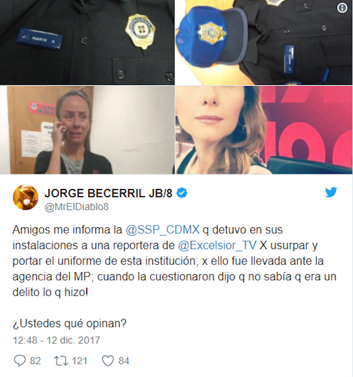 Jimena Duarte reportera de Excélsior fue detenida la tarde de ayer por vestir un uniforme de la Policía Auxiliar y portar una placa, motivo por el cual fue acusada de usurpación de funciones.