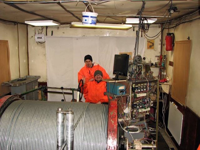 En una serie de imágenes obtenidas recientemente por el grupo de científicos que acaba de incorporarse a la base se aprecia cómo dos científicos echan freón al pozo 5G para nivelar la presión (la del lago equivale a 300 atmósferas).
