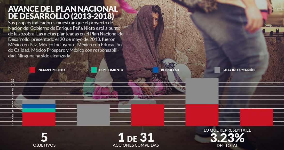 Una revisión de más de sus 300 indicadores, realizada por la Unidad de Datos de SinEmbargo, arrojó logros ínfimos, incumplimiento, atorones graves y ausencia de información sobre todo cuando se trata de combate a la pobreza, lo que Peña Nieto llamó “México incluyente”. Desde que se instauró en 1983, con el entonces Presidente Miguel de la Madrid, el PND jamás ha sido logrado. Especialistas se preguntan si este formato de planeación debe postergarse.