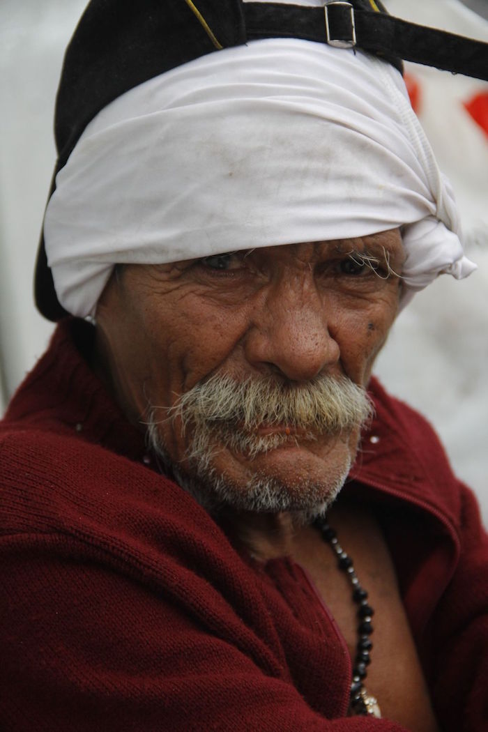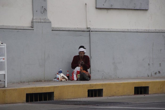 Tirado en el suelo, el señor de la tercera edad trae un trapo blanco enredado en la cabeza. Se protege del frío con un saco guinda. Abajo del saco no trae camisa. Exhibe parte de su pecho desnudo, del cual cuelga un collar de mecate. Varias navidades las ha pasado solo. Esta, no será la excepción. El trapo enredado en su cabeza es para mitigar el dolor.