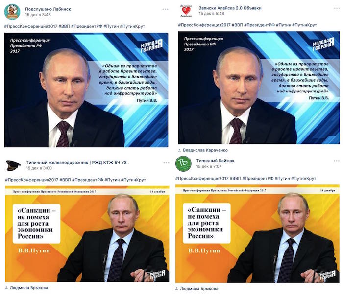 Una mujer que no había publicado en años incluyó en su perfil un mensaje reciente a favor de Putin. Sin embargo, al poco tiempo, su perfil volvió a la vida repentinamente, con una publicación de una cita de Putin con la etiqueta #ПутинКрут en varias páginas comunitarias de Vkontakte. Alguien, presumiblemente sus parientes que todavía tenían acceso a su cuenta, publicó un mensaje para informar a sus seguidores que Lyudmila había fallecido en 2013.