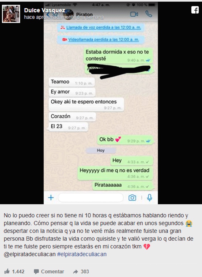 Ciudad de México, 28 de diciembre (LaOpinión/SinEmbargo).- Dulce Vásquez, quien al momento tiene 67 mil seguidores en Facebook y presunta novia de Juan Luis Laguna Rosales, “El Pirata de Culiacán”, compartió un pantallazo de lo que asegura es su última conversación. Lo hizo como una especie de despedida, luego de su asesinato reportado en Tlaquepaque, Jalisco, hace poco más de una semana.