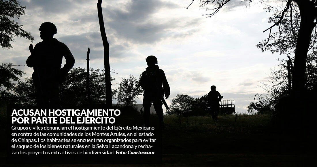 Grupos civiles denuncian el hostigamiento del Ejército Mexicano en contra de las comunidades que habitan en esa reserva de la zona de Chiapas, quienes se organizaron para evitar el saqueo de los bienes en la Selva Lacandona, así como todos los proyectos extractivos de biodiversidad.
