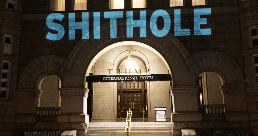 Ciudad de México, 14 enero (RT/SinEmbargo).- La palabra "shithole" (literalmente, "agujero de mierda") fue proyectada durante la noche del pasado sábado en la entrada del Trump Hotel de Washington (EU).