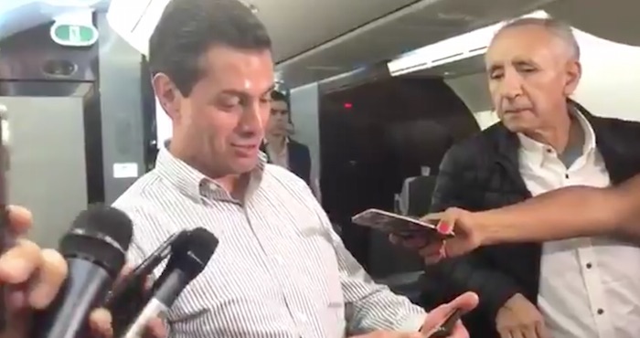 A bordo del Avión Presidencial, el Presidente de México enseñó a los medios de comunicación las fotos de los funcionarios que resultaron afectados después de su visita al estado de Querétaro, donde inauguró del Centro Nacional de Tecnologías Aeronáuticas y entregó el Premio de Ciencia y Tecnología, el viernes pasado.