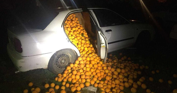 Al inspeccionar los vehículos, se comprobó que estaban cargados de una gran cantidad de naranjas, algunas dispuestas en sacos y otras a granel. Debido a que los sujetos no llevaban consigo ninguna factura, los policías sospecharon que se trataba de un robo.
