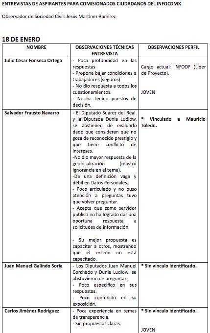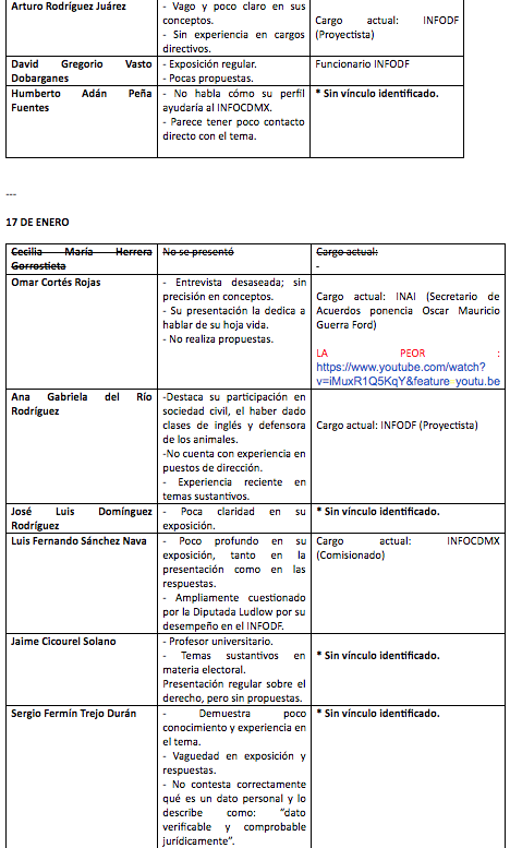 Asimismo, una lista a la que tuvo acceso SinEmbargo, realizada por uno de los grupos de trabajo que dan seguimiento al tema del InfoDF, mismo en el que figuran Alfonso Vázquez Salazar, académico del Departamento Académico de Estudios Generales del Instituto Tecnológico Autónomo de México (ITAM), y los observadores Jesús Martínez Ramírez y Josué Hernández González, refiere que de 66 perfiles sólo seis son"idóneos por independencia, trayectoria, capacidad y desempeño en las entrevistas”.