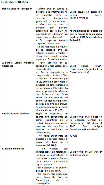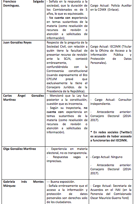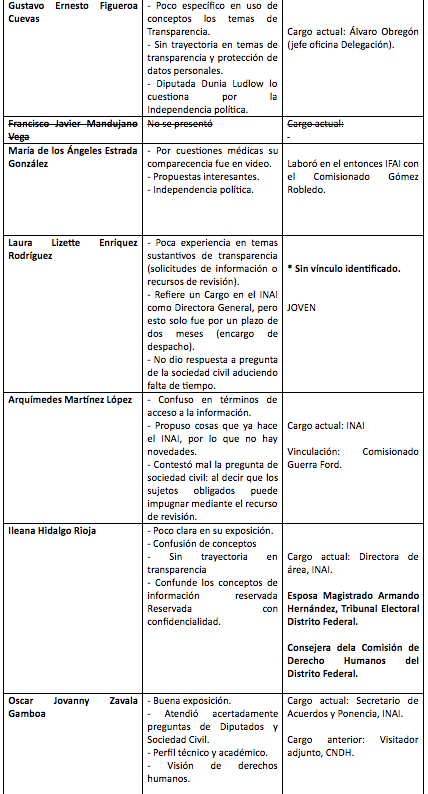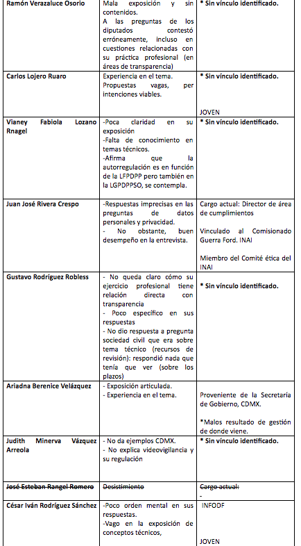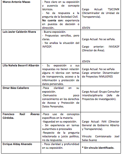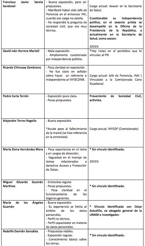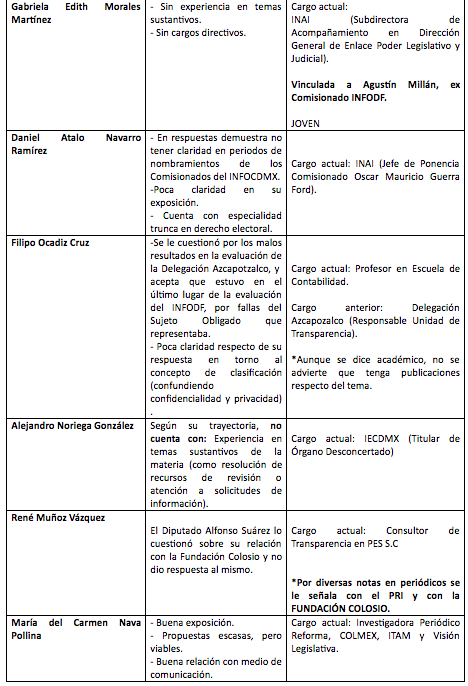 Según la mencionada lista, los aspirantes idóneos son Alejandro Torres Rogelio (actual comisionado), Francisco Varela Sandoval, Judith Minerva Vázquez Arreola, María del Carmen Nava Polina, María de los Ángeles Estrada González y Oscar Jovanny Zavala Gamboa.