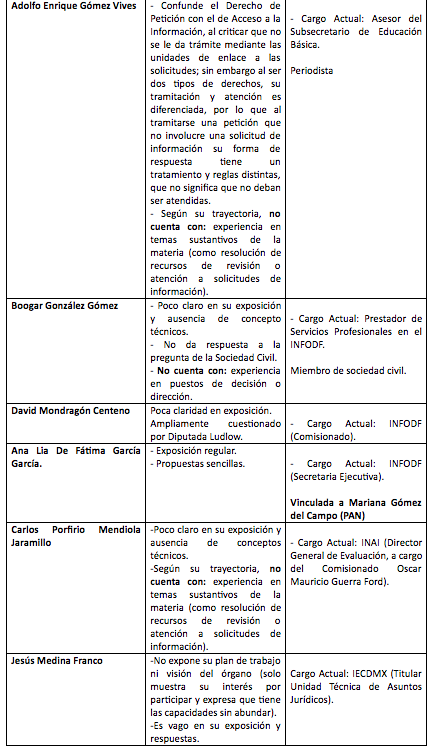 Dos: Muchos de los candidatos -67 en total-, incluidos seis de siete que podrían ocupar un cargo en el InfoDF, más que caracterizarse por su adecuado perfil, son característicos por sus vínculos políticos –presuntos “padrinazgos”–.