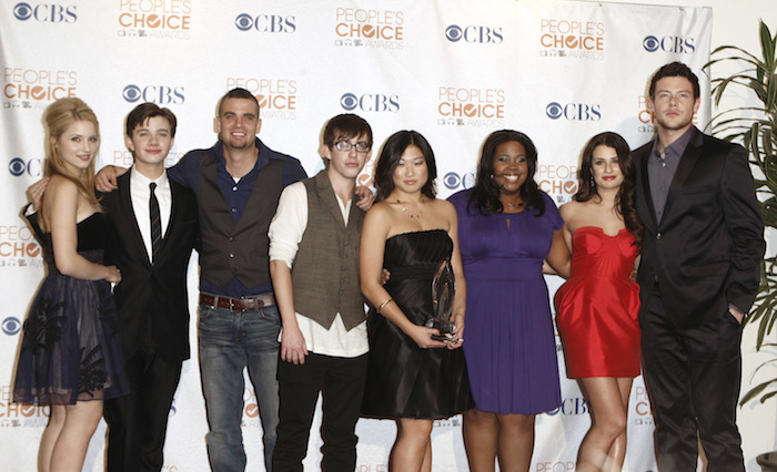 El elenco de Glee, de izquierda a derecha Dianna Agron, Chris Colfer, Mark Salling, Kevin McHale, Jenna Ushkowitz, Amber Riley, Lea Michele y Cory Monteith en 2010.