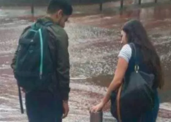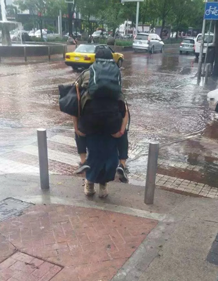 La razón: para que el muchacho no se moje los pies por el agua acumulada debido a la lluvia.