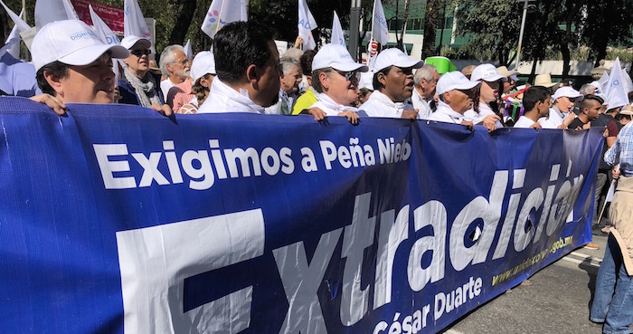 Ciudad de México, 4 de febrero (SinEmbargo).- Miles de personas se reunieron este día en el Ángel de la Independencia y marchan hacia la Procuraduría General de la República (PGR) al concluir en esta capital la Caravana por la Dignidad, que exige la extradición de César Duarte Jáquez, ex Gobernador del Partido Revolucionario Institucional (PRI), acusado de saquear las finanzas de Chihuahua.