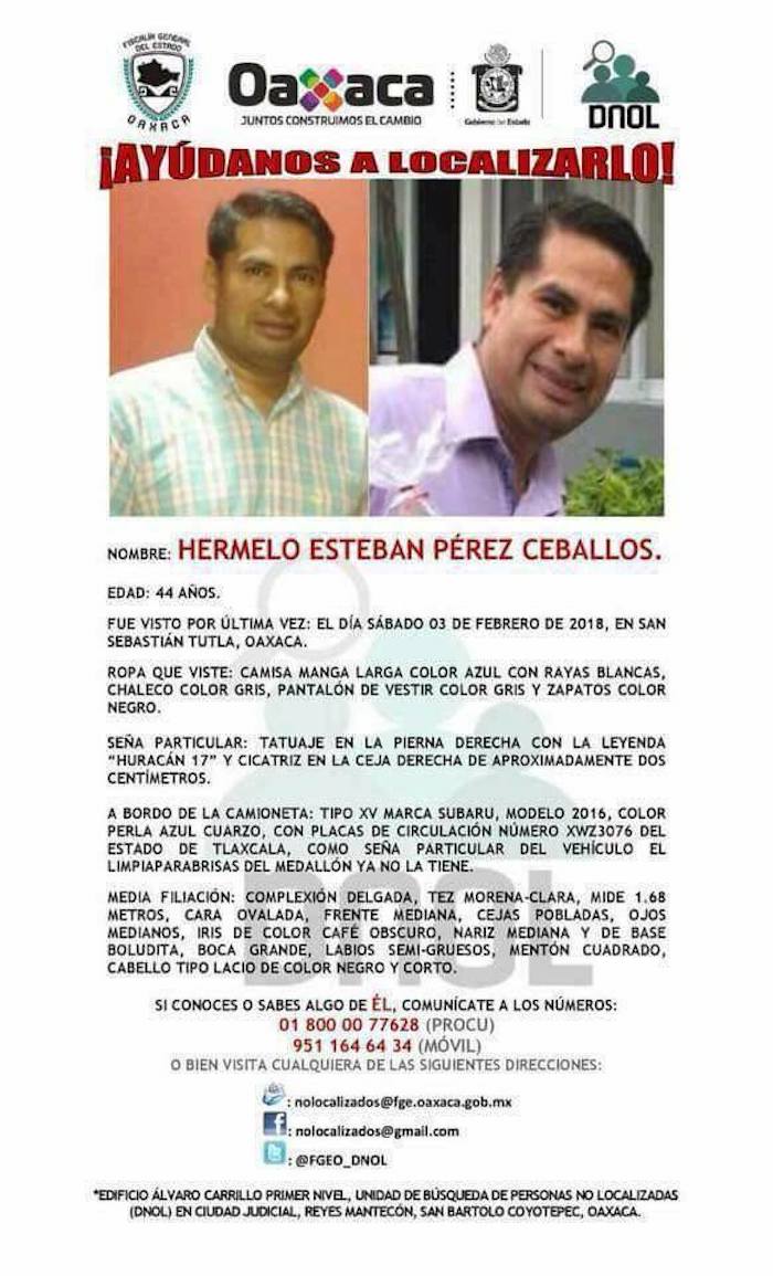 En un hecho similar pero ocurrido en el estado de Oaxaca, municipio de San Sebastián Tutla, Hermelo Esteban Pérez Ceballos, de 44 años de edad, fue visto por última vez el pasado 3 de febrero.