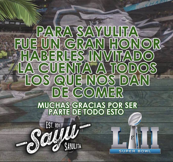 Saltillo/Ciudad de México, 5 de febrero (Vanguardia/SinEmbargo).- Cientos de clientes del restauran bar Sayulita se aventaron un auténtico touchdown, al recibir las cuentas gratis gracias al triunfo de Eagles de Filadelfia en el Super Bowl 2018.