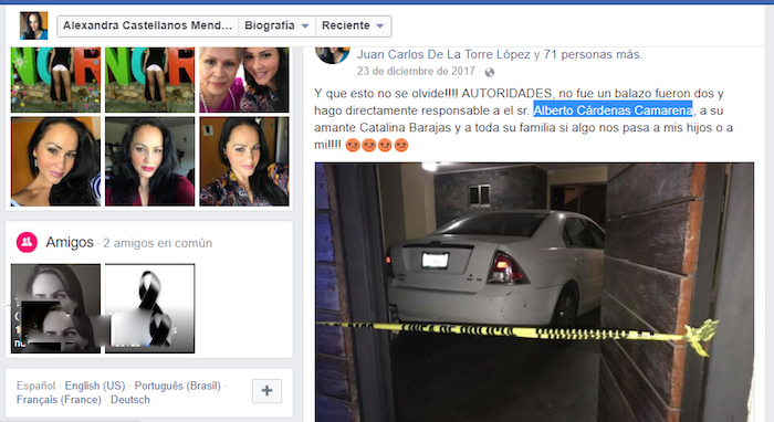 El 23 de diciembre de 2017, nuevamente Alexandra denunciaba 23 intentos de hackear su cuenta de Facebook, haciendo responsable a Alberto y a Catalina. Al día siguiente, en la colonia Jardines de El Zapote, de Tlajomulco de Zúñiga, el cuerpo de Alexandra– con varios impactos de bala– fue encontrado en su auto.