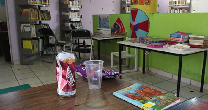Al interior de la biblioteca se hallaron latas de cerveza, platos desechables con restos de comida, una botella vacía de ron, basura esparcida en el piso y evidencias de una manipulación incorrecta de juegos de mesa, libros y materiales diversos.