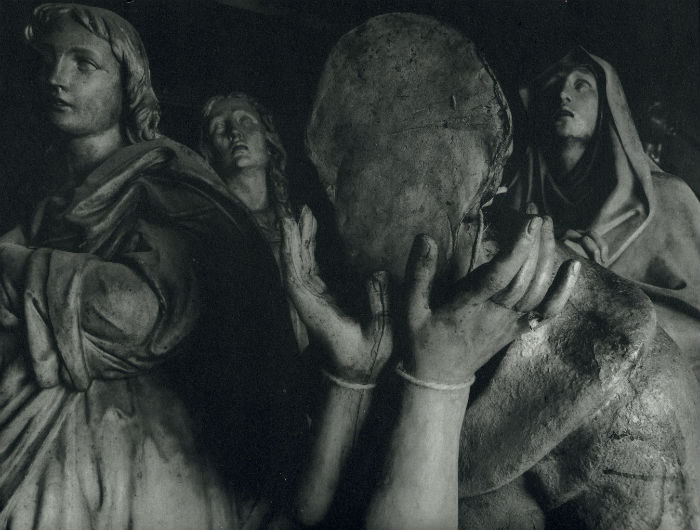 El taller donde se ha adentrado Casademunt es una especie de limbo donde las figuras están inacabadas, rotas, esperando su pequeña porción de paraíso; un limbo, que, además, está formado de dos mundos: el sagrado y el profano. Esta condición, reflejada en varias fotografías, se vincula con la idea de que, en la vida diaria, lo mundano (un póster casi indistinguible, una cuerda, un envase de Cocacola, por ejemplo) convive con lo trascendental por medio de formas, atmósferas “claroscuradas” y técnicas laboriosas. Formas: un cuerpo herido en cruz, unas palmas como un cuenco de angustia, una cara por donde lo inmortal sangra y agoniza. Atmósferas: la luz no usada de la que hablaba Fray Luis de León y la luz terrenal que necesita de sombras para ser plenamente reconocida. Técnicas: el sufrimiento de los cuerpos, el dolor de romper una piedra hasta conseguir su forma humana, el dolor del martirio que lleva a la santidad. Los materiales de trabajo, el puente que empasta a estos dos mundos, el sagrado y el profano.