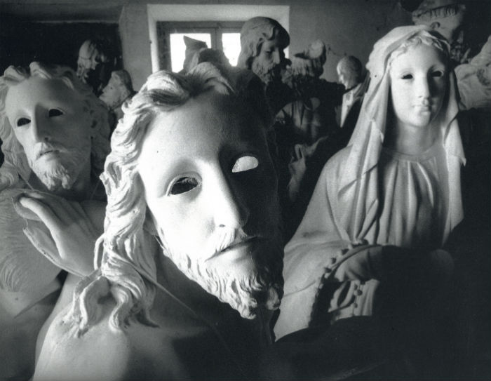 Talleres: teatros para construir las formas del mundo. Se prepara el molde, se vacía la mezcla, se seca hasta quedar como sangre, se liman los sobrantes de un alma. El hombre crea a Dios a su imagen, fabrica religiones de yeso, mitos de arcilla, historias de porcelana. Los actores de estos terrosos teatros son los artesanos, orfebres de piedra. Los diálogos, los sonidos de hornos, el ruido de una porcelana al romperse, el golpeteo de pequeños martillos y cinceles y la voz polvosa que sale de una vieja radio. La trama se entrevé por el cuerpo de los santos; por ello, las fotografías de Tomás Casademunt, prueban que cada figura tiene una hagiografía por contarse, a través de sus posturas, facciones o punzantes heridas.