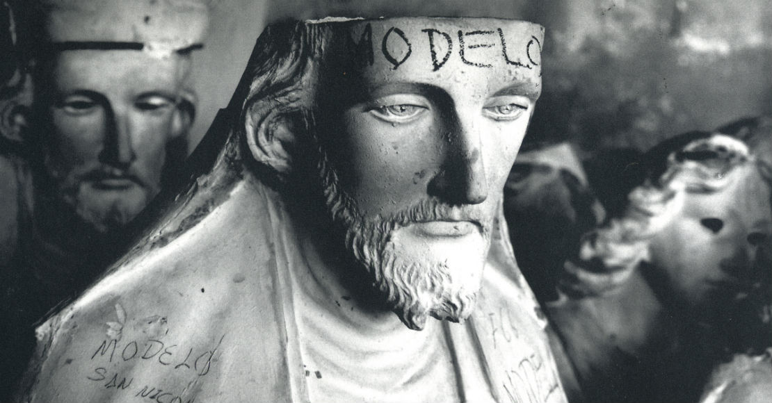 Talleres: teatros para construir las formas del mundo. Se prepara el molde, se vacía la mezcla, se seca hasta quedar como sangre, se liman los sobrantes de un alma. El hombre crea a Dios a su imagen, fabrica religiones de yeso, mitos de arcilla, historias de porcelana. Los actores de estos terrosos teatros son los artesanos, orfebres de piedra. Los diálogos, los sonidos de hornos, el ruido de una porcelana al romperse, el golpeteo de pequeños martillos y cinceles y la voz polvosa que sale de una vieja radio. La trama se entrevé por el cuerpo de los santos; por ello, las fotografías de Tomás Casademunt, prueban que cada figura tiene una hagiografía por contarse, a través de sus posturas, facciones o punzantes heridas.