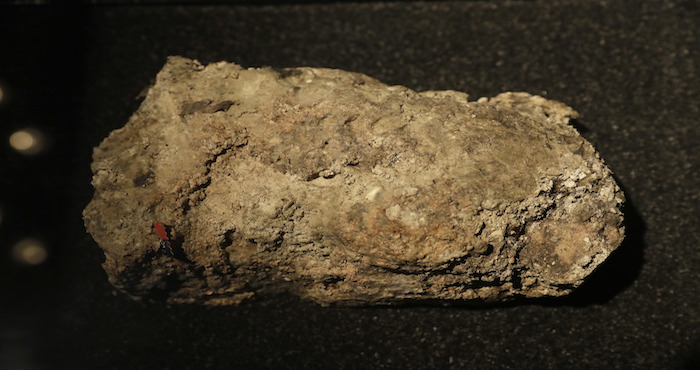 El museo conservó un trozo del tamaño de una caja de zapatos, que un empleado comparó, por su consistencia, con una combinación de queso parmesano y roca lunar. Tres cajas transparentes, una dentro de otra, protegen a los espectadores de bacterias posiblemente letales y del mal olor.
